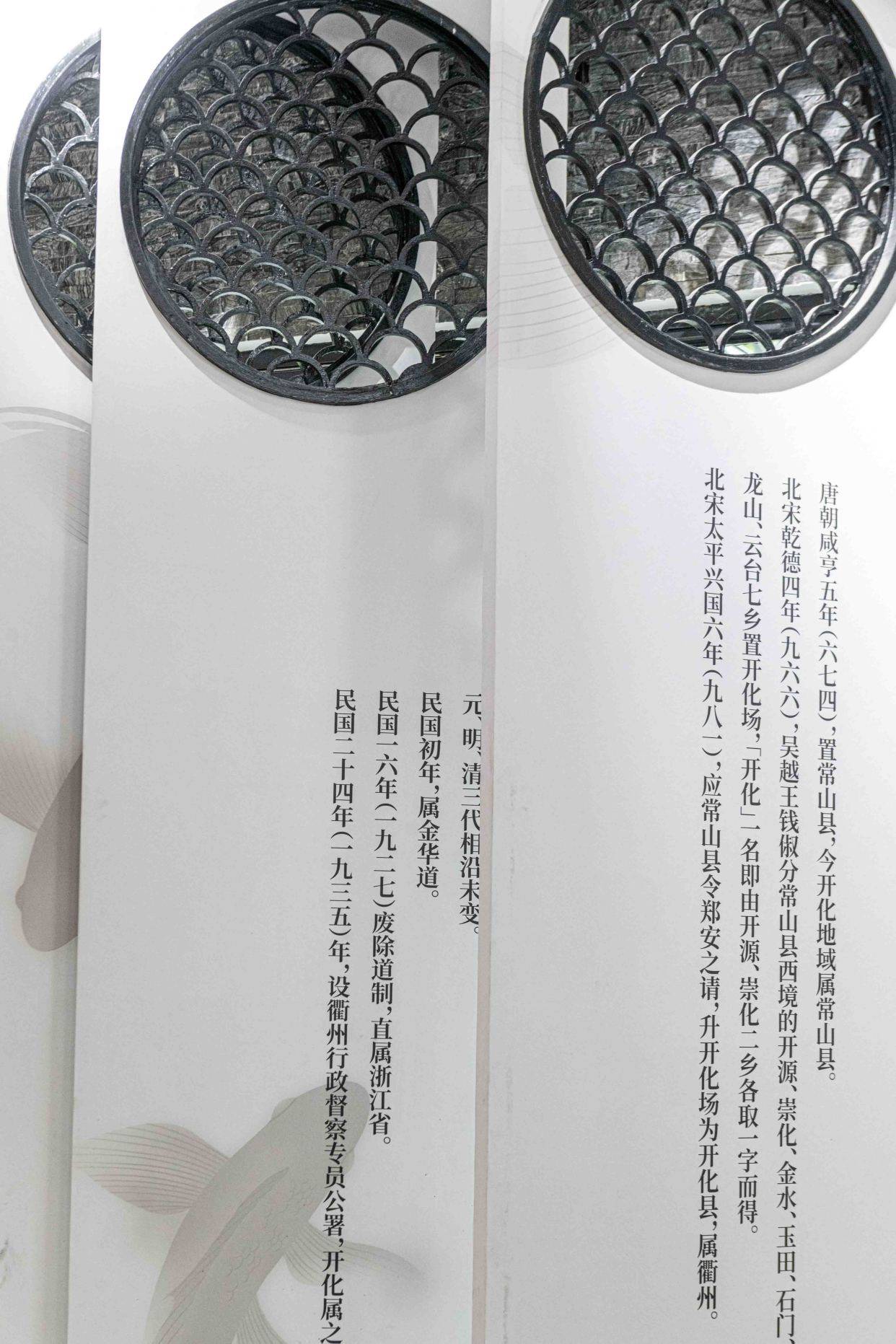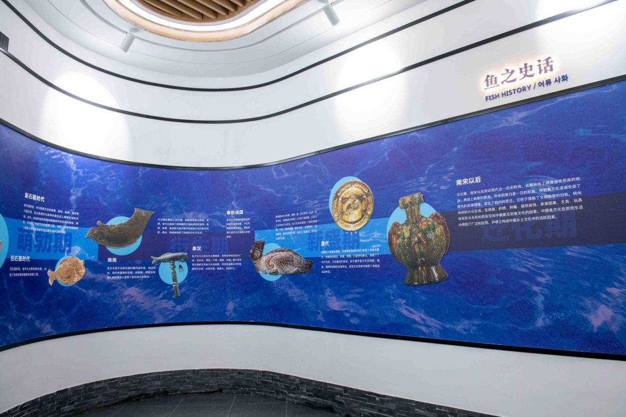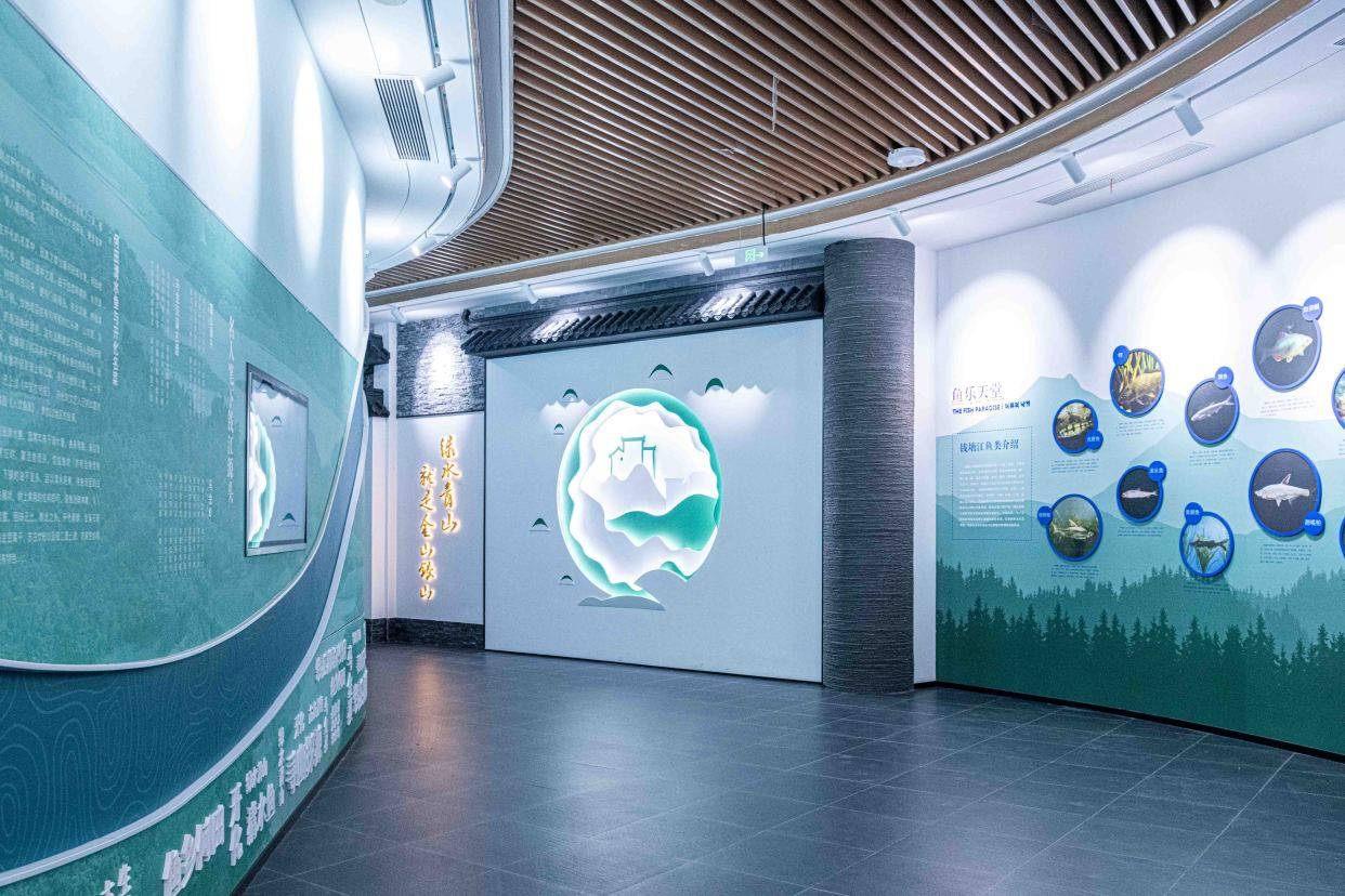 该博物馆由展示区、体验区和服务区三部分组成,以鱼文化为背景,以开化清水鱼为主题。博物馆通过三大主线:“鱼道悠远 世代庆‘余’”、“人鱼和谐 年年有‘余’”、“山水灵境 风物闲美”,呈现出了21个展示单元和配套功能区域,如3D互动投影、多媒体秀等。