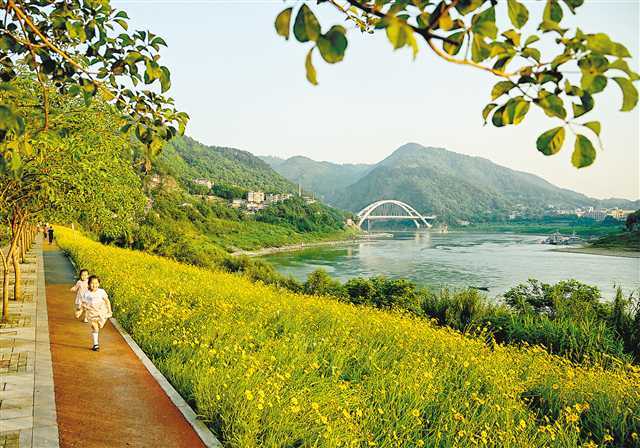5月16日,北碚区东阳街道位于嘉陵江畔的滨江公园,市民在鲜花盛开的滨江步道休闲。
