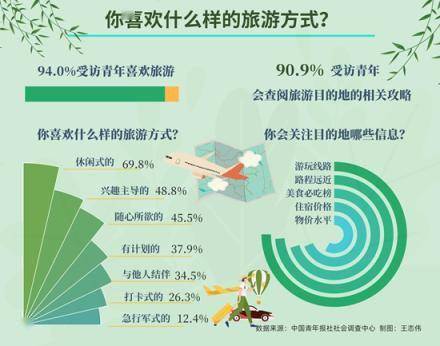 年轻人喜欢什么样的旅游方式?调查显示,69.8%的受访青年喜欢休闲式的旅游,48.8%的受访青年喜欢兴趣主导式的旅游。可见,放松的“慢游”更受受访青年青睐。
