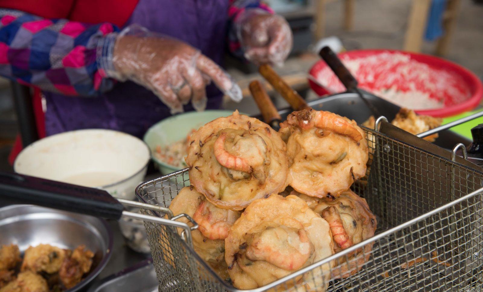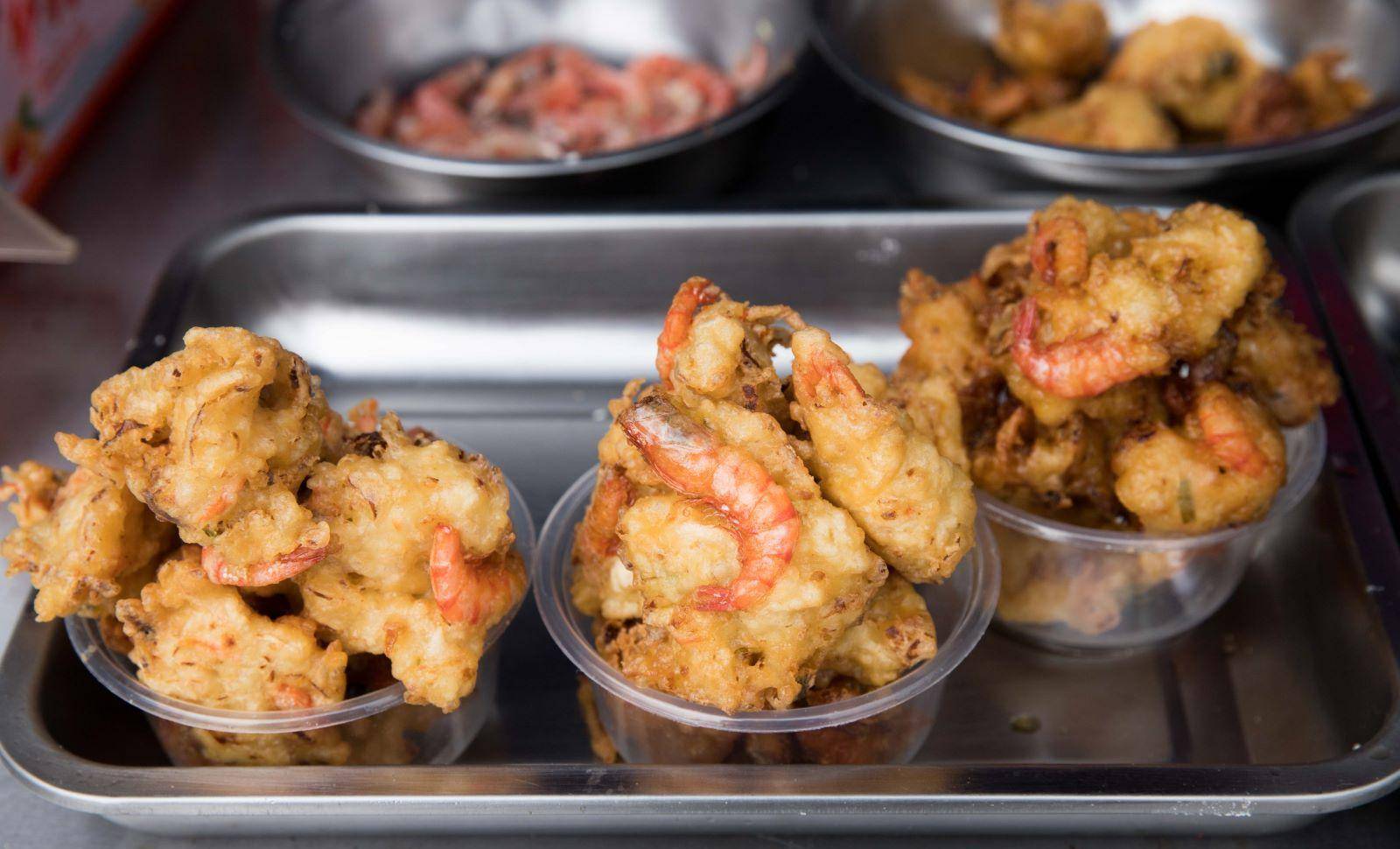 海蛎饼,是一种油炸食品,做法比较简单:提前用米粉或者豆粉做成米浆,糊在大勺底部,再放入提前用调料腌制好的紫菜、包菜、肉以及海蛎等(有的商家为了吸引客人,还会再加上一只小海虾),上面再糊上一层米浆,然后放油锅里炸至金黄,捞起待凉,一口下去,先酥后嫩,油而不腻,口齿留香。