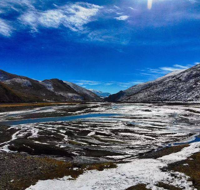 在去色达的某个路上,被大山围住的河流,与雪景交融,是否很美?