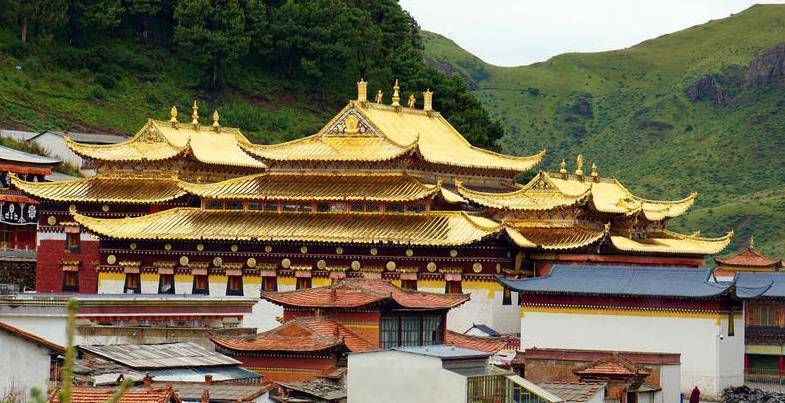 两个寺庙各有千秋,都很有特色,甘肃省那边的“达仓郎木赛赤寺”是建在一个山坡上,整体建筑虽高低错落,但是金碧辉煌,一进入寺庙便可看见很多白体镶金的高塔,寺庙里随处可见金光闪闪,据说这里每一栋大殿的屋檐、房顶都是鎏金的,而且都是真金,哪怕是阴天,一样可以耀眼的很。