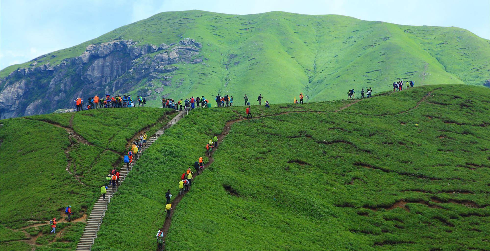 如果不坐索道,那便在听松处直行,一路上可以感受回音谷的妙趣与大自然对武功山的精雕细琢,感受徐徐山风,沉浸于满目苍绿之中,一路欢笑相伴地攀爬山路,可到达海拔近两千米的金顶,也是武功山的最高点。这三条上山的路都可到达山顶,只是到达的位置不一样罢了。在海拔1600余米的高山之顶上,十万余亩的草甸绵延于此、一望无际,云雾缥缈、彩云绕石,好一幅奇丽的云端草原图,运气好还可以观赏到云海日出,不过需要是大晴天才可完美地将这景致呈现出来。