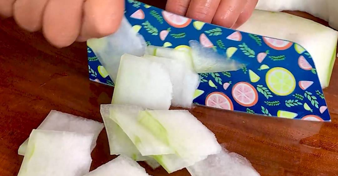 1、首先把买回来的冬瓜切掉外皮,再用小勺子把瓜瓤刮掉,接着把冬瓜切成薄片,稍微切的薄一点,这样熟的也比较快,切好的冬瓜先放在一边备用。
