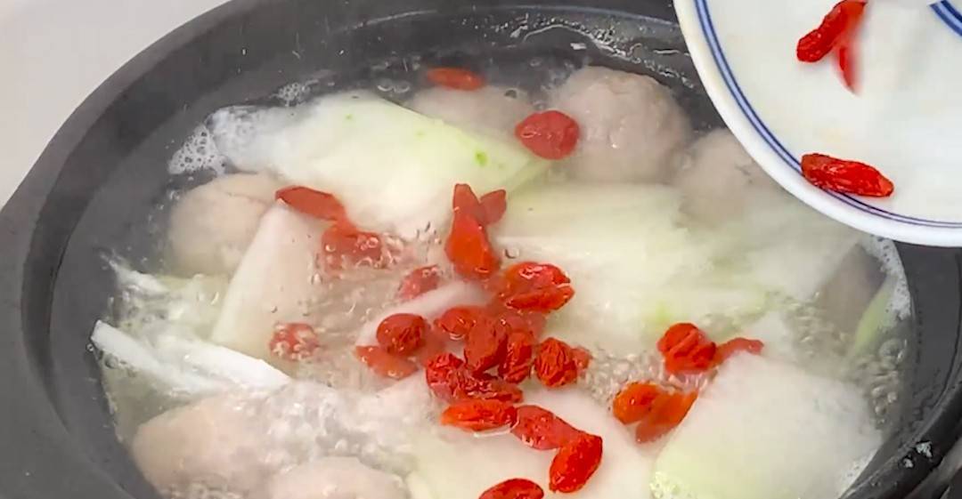 7、时间到了加入一点枸杞,煲了15分钟,这个冬瓜也已经软烂了,再往里面加入适量的盐,少许的香菜段,再次搅拌均匀就可以把火关掉了。一碗清甜解暑的冬瓜肉丸子汤就做好了。