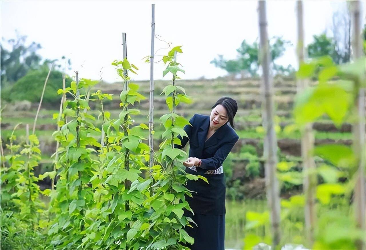 ▲周扬眉在管护自己亲手种下的豇豆。