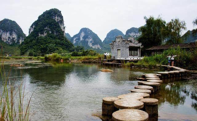 鹅泉位于靖西县城南六公里,其实是一个景色宜人的自然古村落,鹅泉的锦鲤很多,据说古时候农历三月三,人们会向泉里撤米,敲锣打鼓,泉中的鲤鱼就会踊跃跳出水面抢食,称为靖西八景之一的“鹅泉跃鲤三层浪”。在这里最美最惬意的时刻是夕阳西下的时候,村里的小孩在水边嬉戏打闹,好一幅乡村美景。