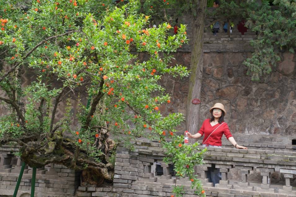 而在华清宫景区,近百株浸润岁月的百年石榴古树恣意绽放,将白墙红柱的唐宫建筑点染得充满生机、红火繁荣。特别是在景区环园中,一棵老石榴树盘根错节,临水而生。石榴树的主体部分已经“挣脱”池塘围栏的束缚,倾斜着向水面生长,其枝干苍劲有力,枝叶繁茂。虽然历经千年,枝叶依然青翠茂密,尽情地吐露着千年芳华。