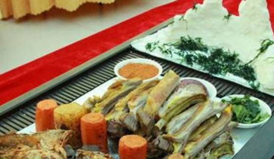 “芋芋土鸡”是阿勒泰地区最北端哈巴河县的最具地方特色的风味小吃,其原料是当地农民自己饲养的“绿色鸡”,在加上独具匠心的做法,使的这道菜融入了极浓郁的新疆特色。所谓“芋芋”其一是指个头匀称、沙软香酥的当地特产洋芋(土豆),其二是指用鸡蛋、精面经特殊加工而成的“拨芋子”。“肚装全羊”是哈萨克族传统美食。据说是牧民在游牧和搬迁中时,都会准备半个多月的食品,这“肚装全羊”就是其中的一道。因为羊肚子含有特殊的物质,将肉装进羊肚,进行三个多小时的水煮,肚内羊肉熟至恰到好处,肚子不会被煮得四分五裂。“肚装全羊”还有一种做法可谓世间罕见:将沙地挖掘一米多深,将新宰杀的羊肉装入肚内,放进沙坑,填埋,最后再沙坑上方烧柴,直至将沙坑里羊肉烤熟,这样一个过程大约需要八个小时左右。使用这两种方法做出来的羊肉,保存了羊肉的美味,又可存放半个月左右,无论是加热食用,还是凉着食用,都非常适宜。