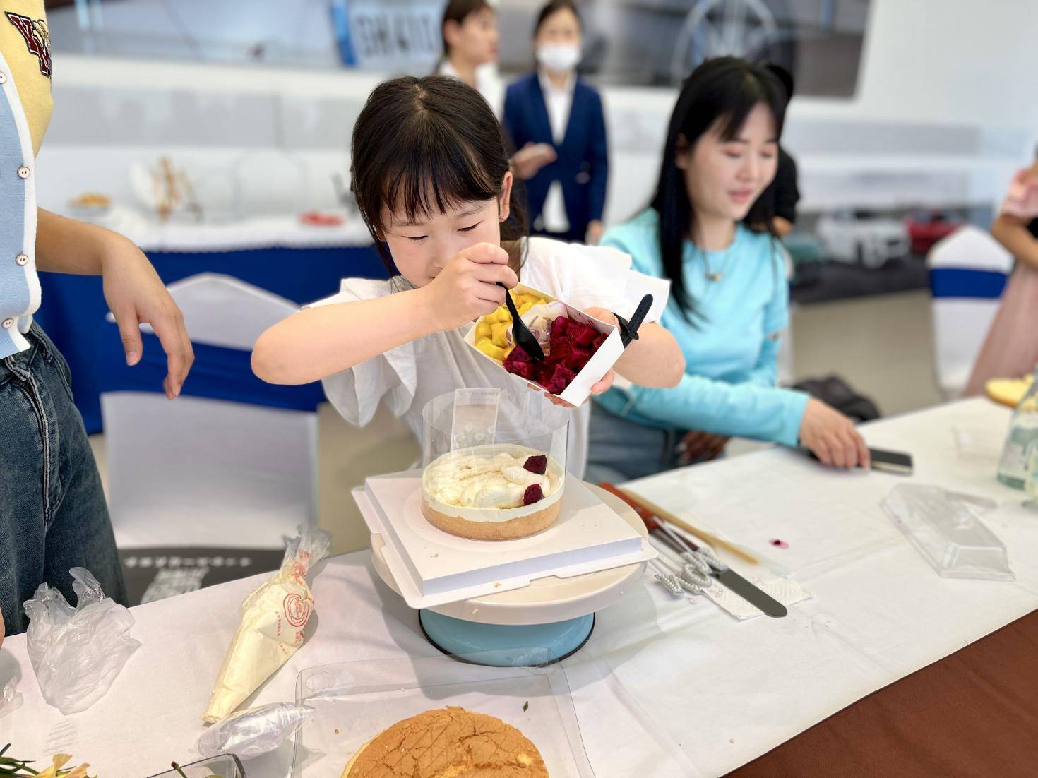 孩子们在父母的陪伴下现场DIY属于自己那一份爱的蛋糕,按老师的指导一步步制作,挑选装饰品以及修边时与大人们的配合,认真专注的劲儿真的太可爱了。