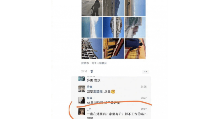 5 月 14 日,一位微信好友在其发布的西藏动态下评论:" 一直在外面玩?家里有矿?都不工作的吗?呵呵。"