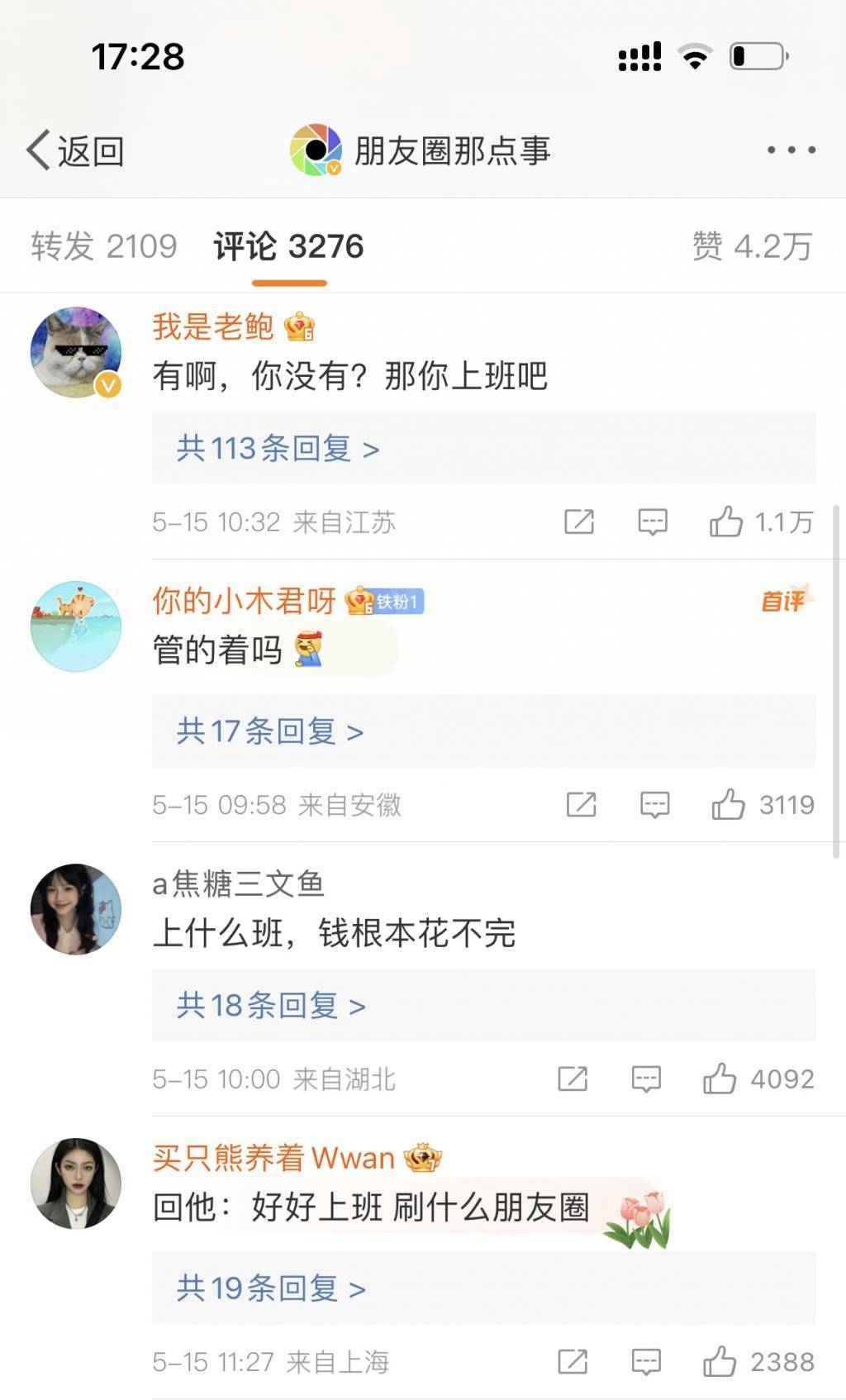 这个 先生先生表示,热评里 " 好好上班,刷什么朋友圈 " 的评论他觉得很有意思。