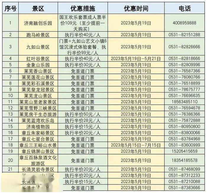 其中,莱芜香山景区、莱芜莲花山景区、莱芜彩石溪景区、莱芜皇龙冠景区、莱芜龙山景区、莱芜山里老家景区、莱芜雪野三峡景区、章丘七星台景区、章丘三王峪山水景区、章丘锦屏山景区、章丘百脉泉酒文化旅游区、长清大峰山景区免首道门票。