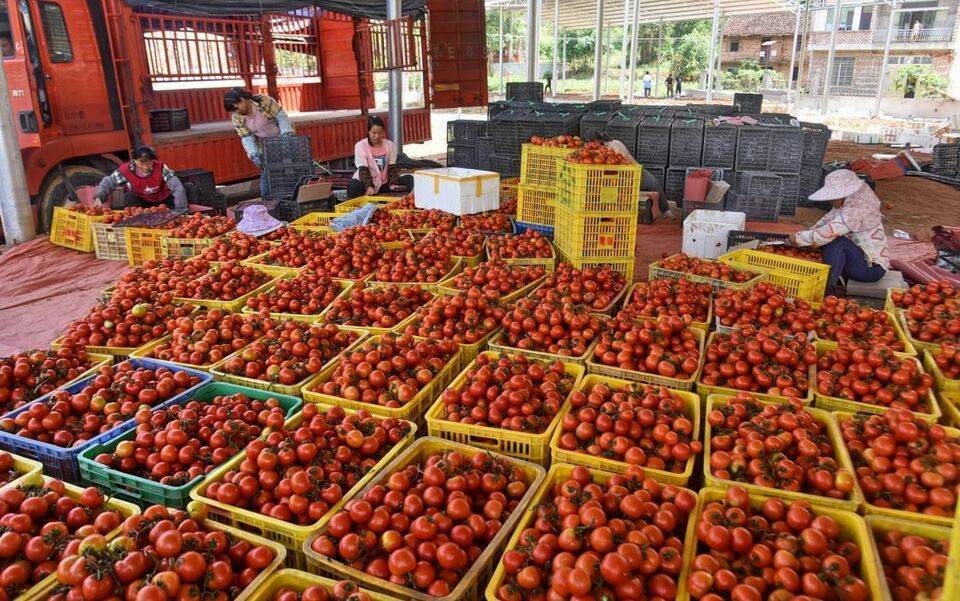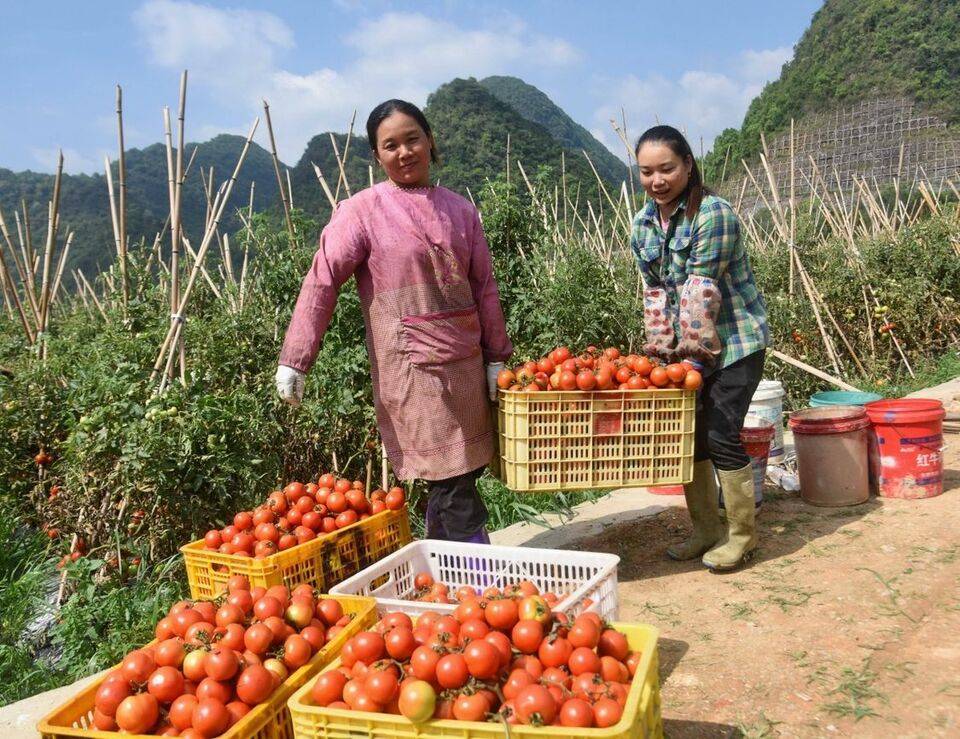 今年第一季度,百色田阳区北部山区坡洪镇新建村带头连片种植50亩良种番茄,如今整片番茄喜获丰收,一派特色产业诱人景象。图为5月16日,群众在开始摘收正成熟的番茄投放市场。通讯员 黄国顺 甘霖 摄