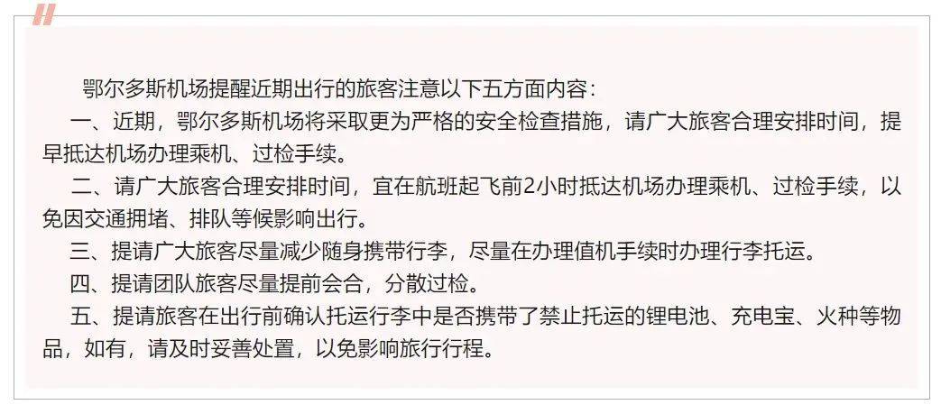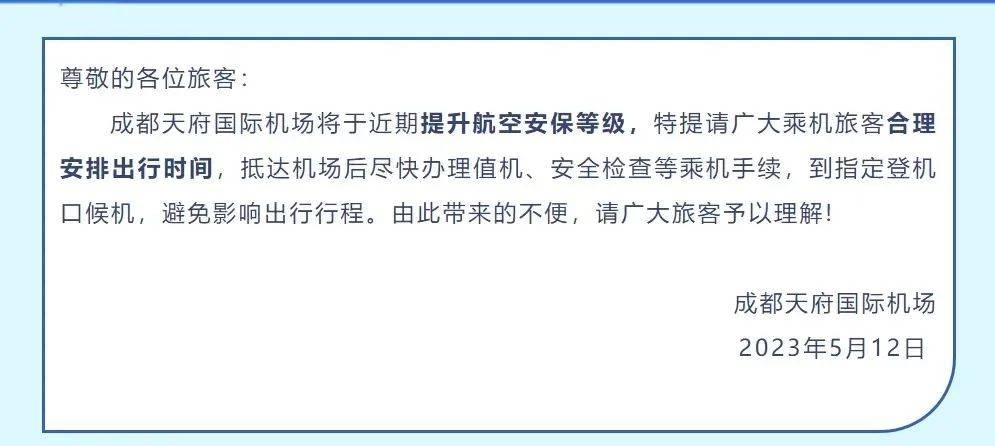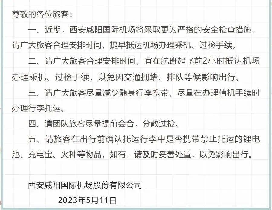 此外,近日 成都双流国际机场、成都天府国际机场、西安咸阳国际机场以及 鄂尔多斯国际机场相继发布提醒,将采取更为严格的安全检查措施。多家机场表示,旅客朋友们宜在航班起飞前2至3小时抵达机场办理乘机、过检手续,以免因交通拥堵、排队等候影响出行。