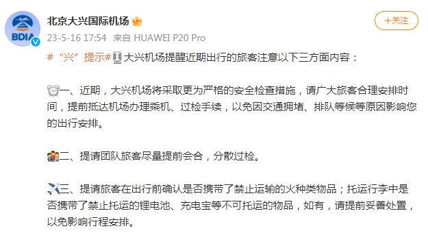 首都机场5月16日发布提示称,近期,首都机场将采取更为严格的安全检查措施,请广大旅客合理安排时间,提早抵达机场办理乘机、过检手续。