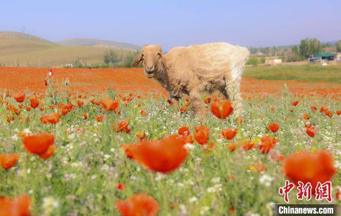 羊群也来“打卡”草原红花。 李金维 摄