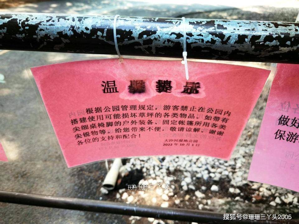 出了地铁在进入公园的路上,珊珊三丫头遇见几个老人,他们一路走一路闲聊:“今天不是周末,人不多,我们几个就可以过来走走逛逛,如果到了周末,就有许多露营野餐和家庭聚会的来这里,人太多,我们就没必来了……”,在入口处,我发现栏杆上也标记了搭建户外装备及露营帐篷时的注意事项,从老人聊天话语及园内露营注意提醒中,可以感觉到眼前的大沙河湿地公园是观赏悠闲,露营野餐的好的地方。