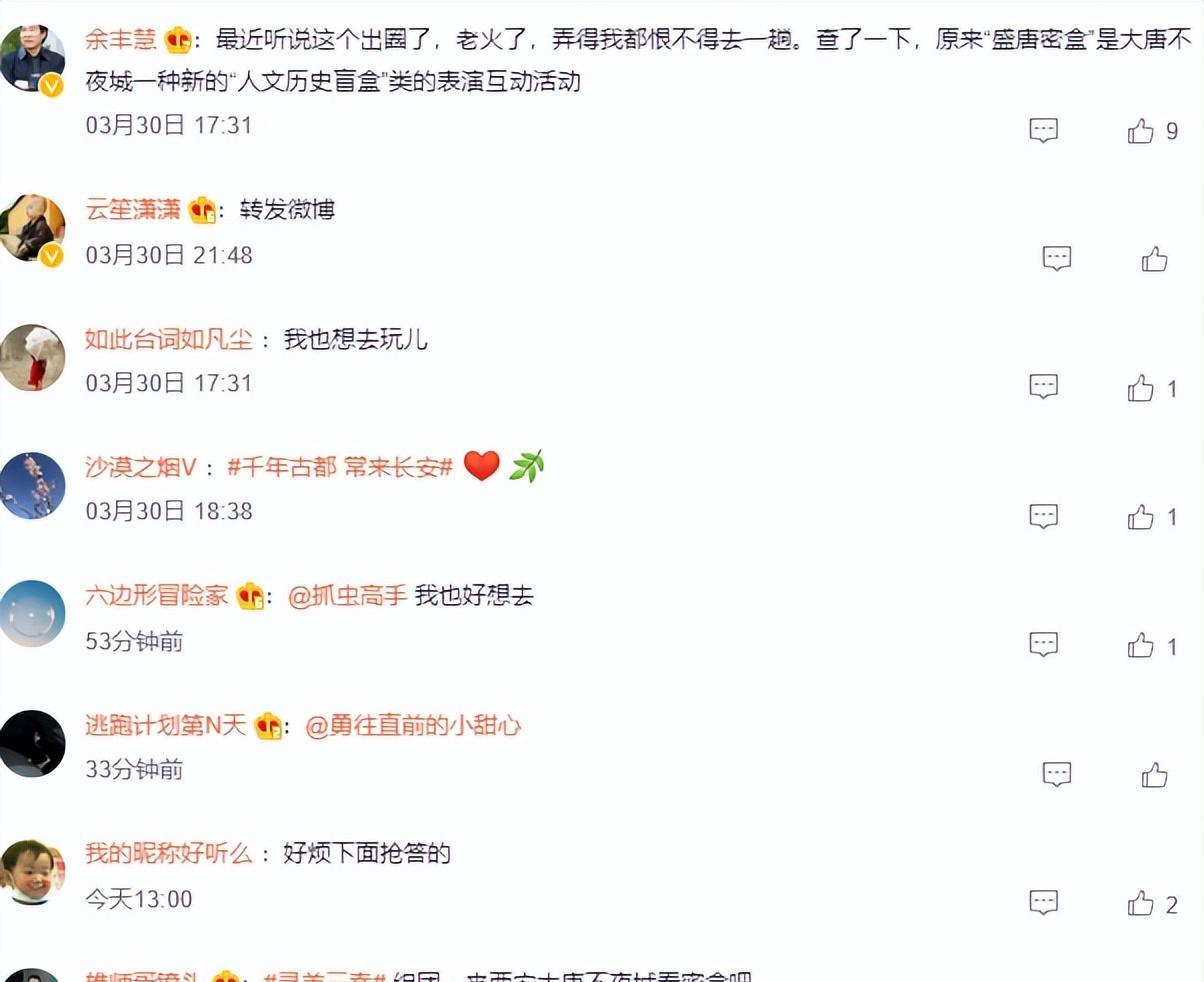 最近大唐不夜城再一次出圈了,上次是绝美的不倒翁姐姐,这一次全国网友想去西安看盛唐密盒。“盛唐密盒”是大唐不夜城一种新的“人文历史盲盒”类的表演互动活动,通过“演艺+互动”的形式,如让唐朝名士“房玄龄”“杜如晦”以盲盒的形式出现在游客面前,每个角色分别设定经典语录,突出各自人物特点,通过与游客互动对话的形式揭晓身份,带给观众新奇的体验。