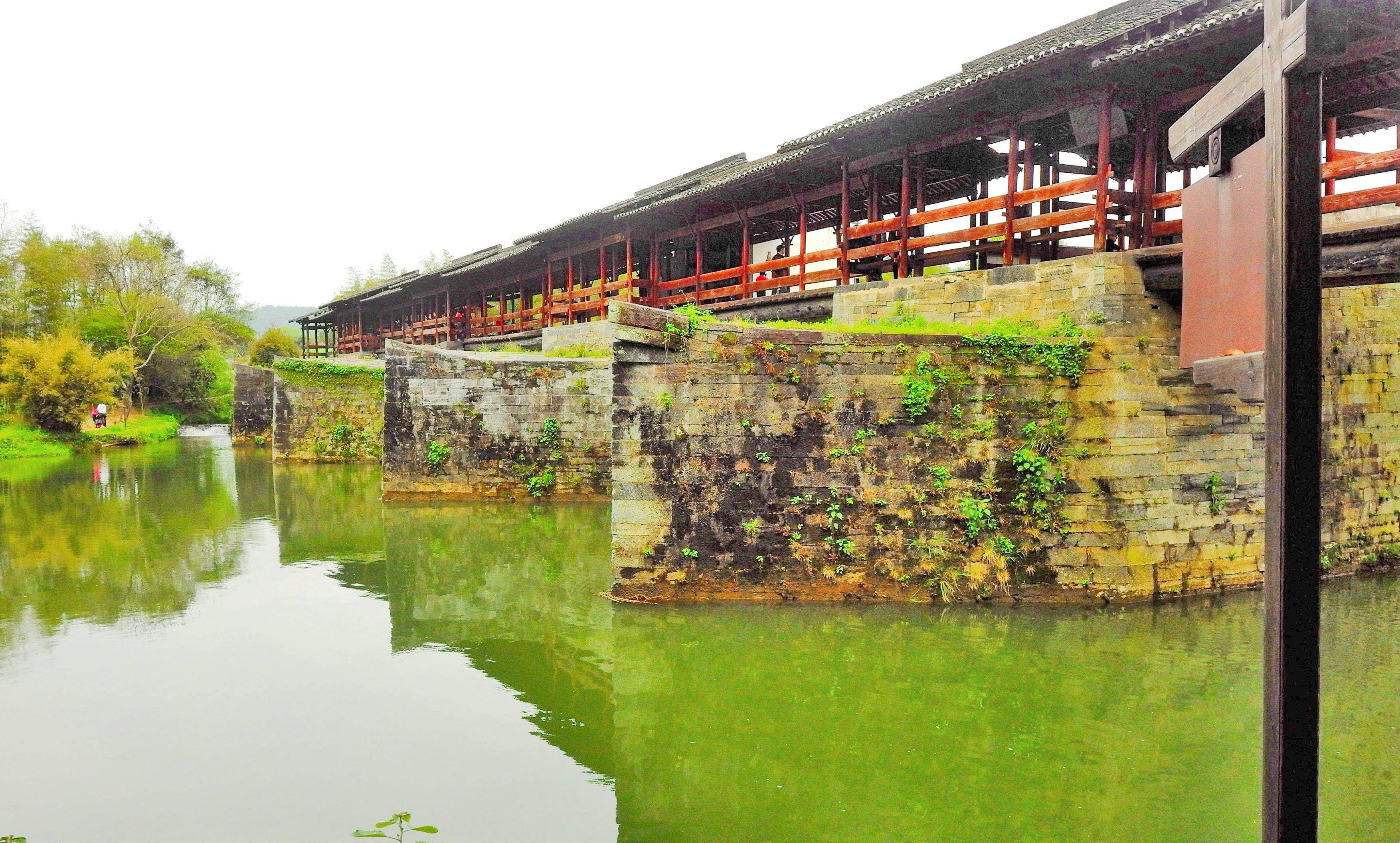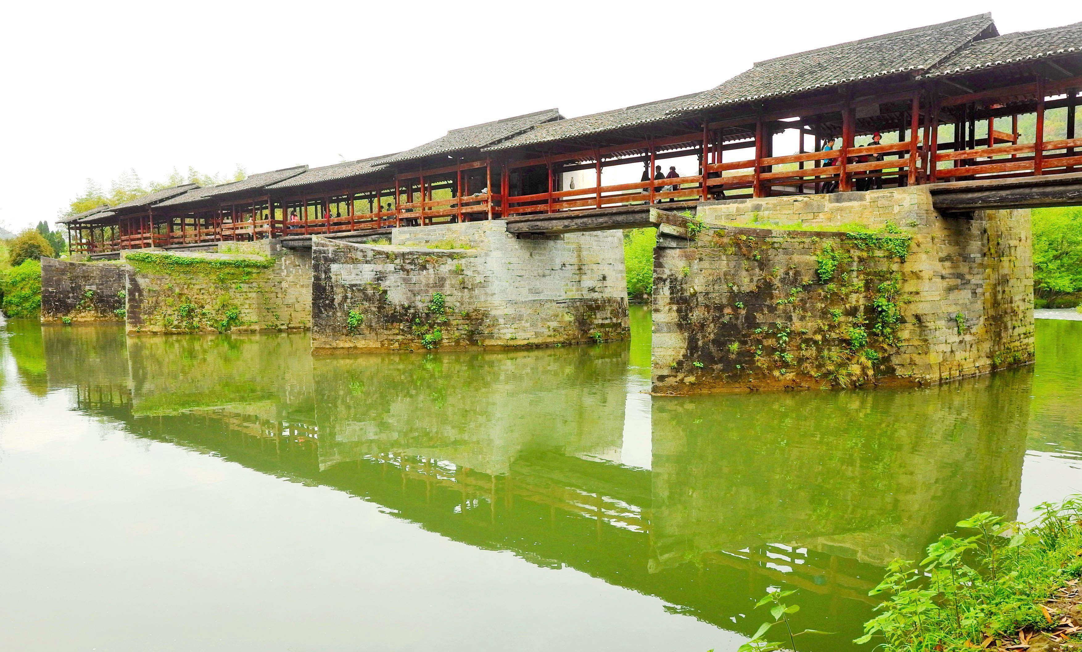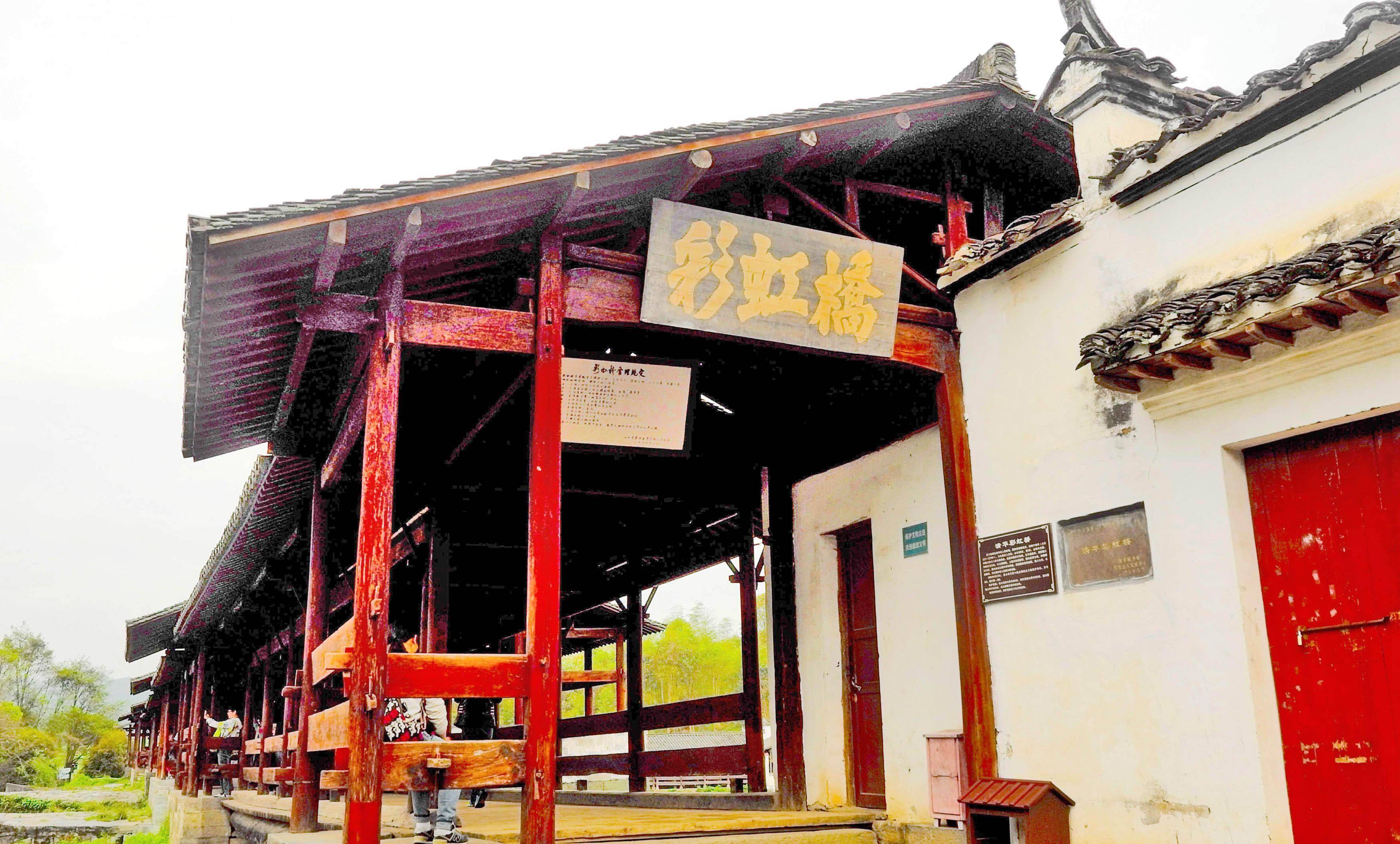 前几年去婺源,第三天一早去彩虹桥。桥在清华镇边上,这是婺源有名的一座廊桥,据说是古徽州最古老、最长的廊桥,被许多人誉为“中国最美的廊桥之一”。桥建于南宋,有800多年的历史啦,全长140米,六亭五桥是其特点。因唐诗“两水夹明镜,双桥落彩虹”而名。传说,桥落成之日,有彩虹出现。