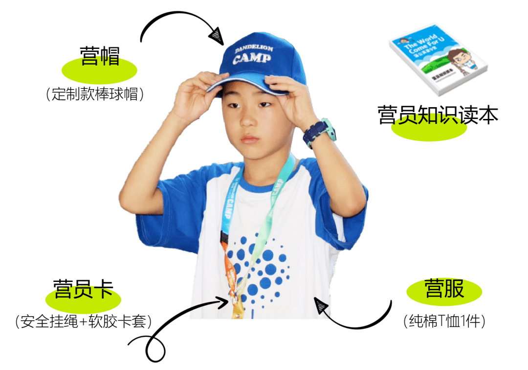 统一纯棉营服1套、营帽1顶、营员胸卡、营员手册、课程地图。