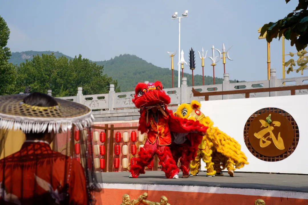 在开市仪式现场,伴随着震撼的中华龙鼓表演,现场氛围逐渐热闹了起来。少林功夫表演和经典武侠cp秀引得现场游客的阵阵喝彩,还有舞狮表演点燃了游客们的热情!