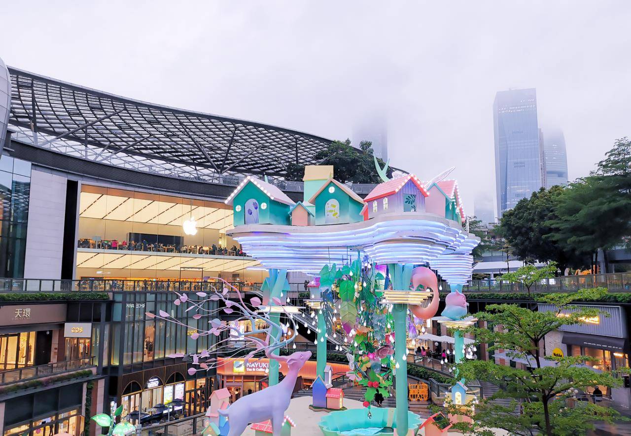 天环融合时下正兴的回归户外趋势,创造生机灵动的森林奇境。从户外大楼梯向下,经过下沉式广场一路往南,可见瀑布花海以及麋鹿、彩蝶、松鼠、蜂鸟、猫头鹰和长颈鹿等一众森林“萌友”。