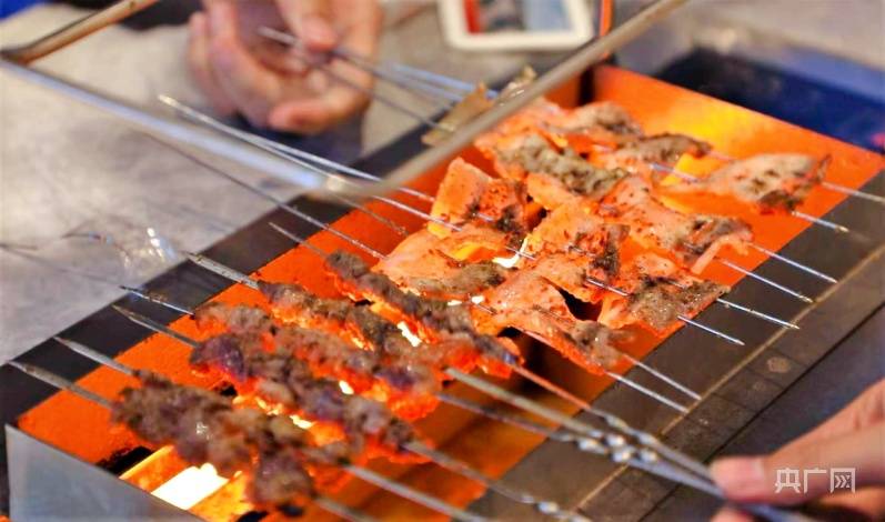 肉串在烤炉上“滋滋”冒油,升腾起“烟火气”(央广网记者刘博伦 摄)