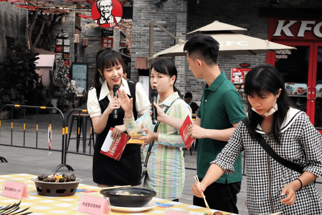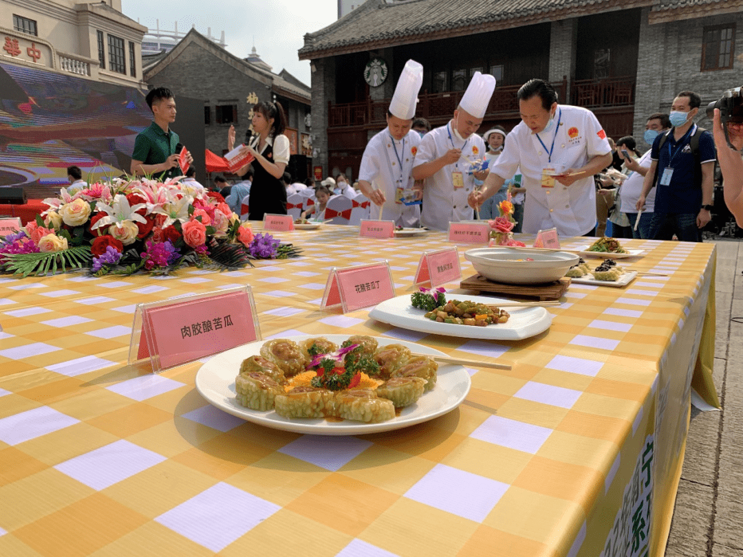 苦瓜田螺焖青头鸭、苦瓜肉丸串串烧、酱拌苦瓜、苦瓜煎蛋饼、养生苦瓜丁、黄豆苦瓜煲肉排、黄鱼炆苦瓜、苦瓜炒牛肉、瑶柱虾干煲凉瓜等创新菜式惊艳登场。3位专家评委和10位大众评委投票选出10道苦瓜创新菜式,定为五塘苦瓜宴的菜单。日后,这10道菜式将成为五塘镇的名片,款待前来五塘游玩的游客。