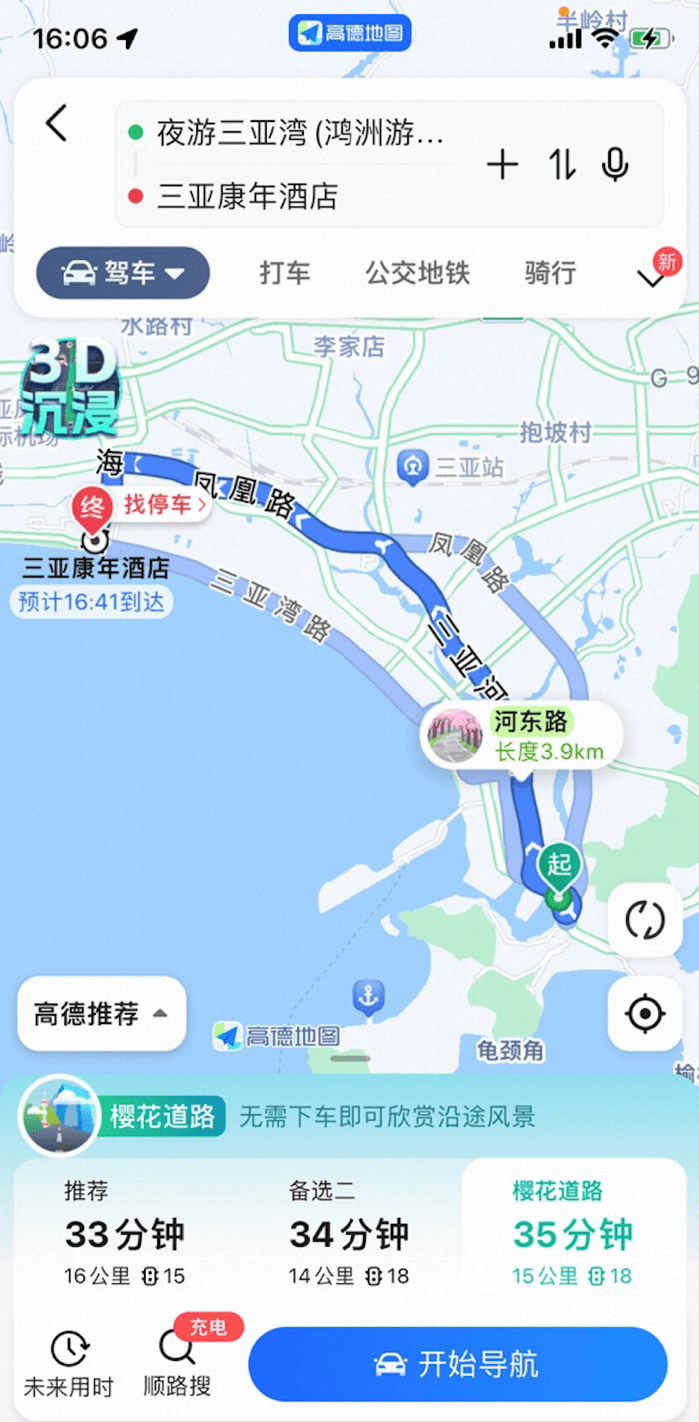 以海南省三亚市为例,某用户在高德地图APP上规划从三亚湾前往某酒店的驾车路线,如今在选项中除了时间或距离优先的方案之外,还能够看到高德地图智能筛选出的风景路线——在这个具体案例中,高德为用户推荐了一条虽从时间和距离的维度并不完全占据优势(但也不会相差过多)、不过沿途却有樱花美景的路线,方便有此“雅兴”的用户选择。