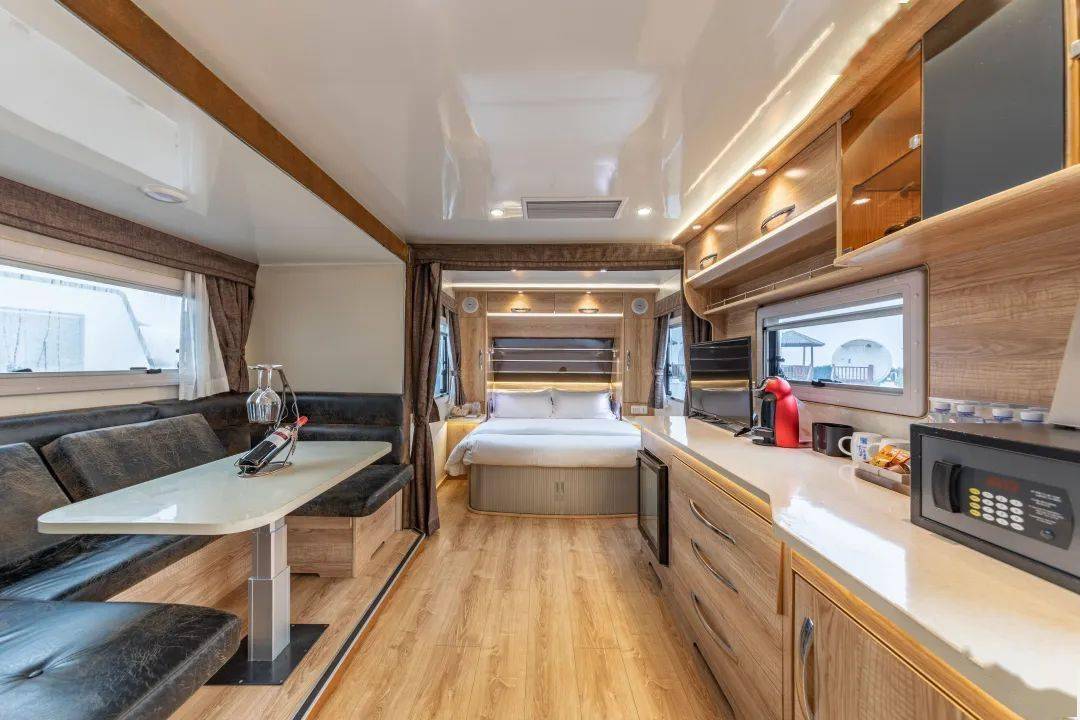 澳洲拓展式房车特色客房,专用庭院式营位,超现代化、充满科技感的室内设计,独立的卫生间,茶水吧台,操作台。