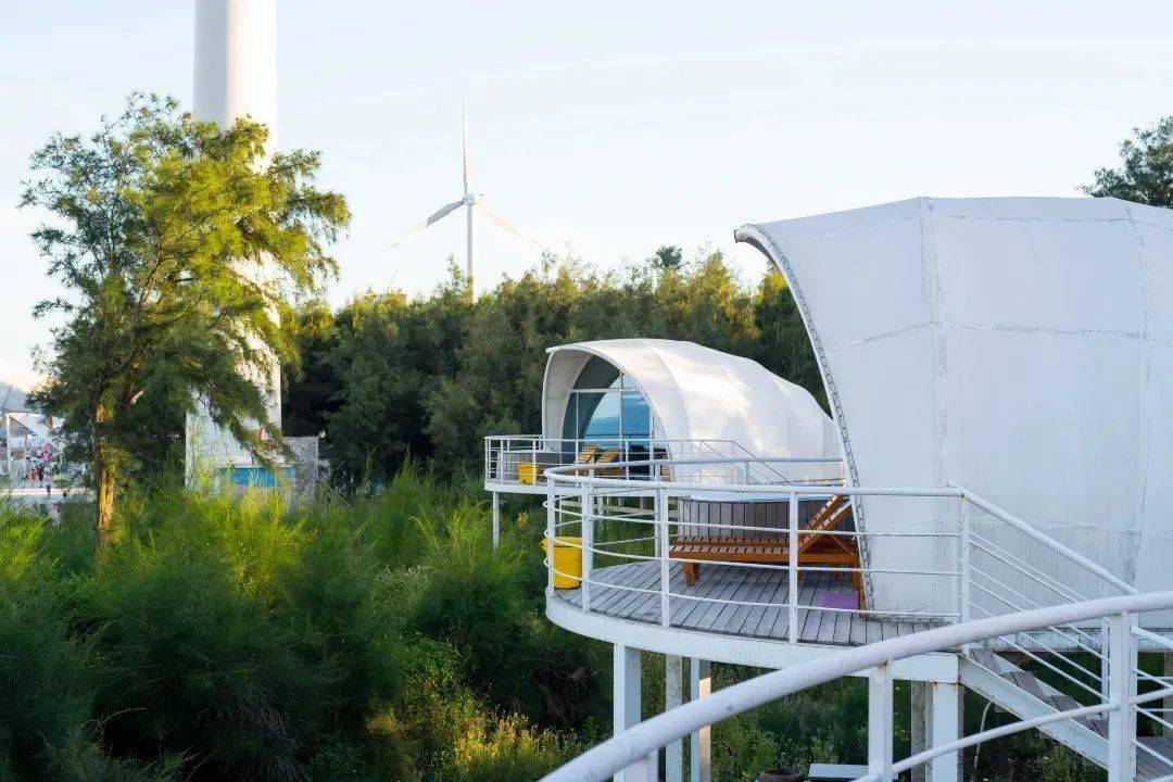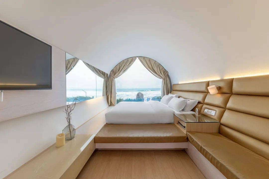 独立的帐篷造型,其设计灵感来源于海贝壳,独立的景观台,室外海景浴缸。静听海浪声,风车声,渔船声,感受极致浪漫。