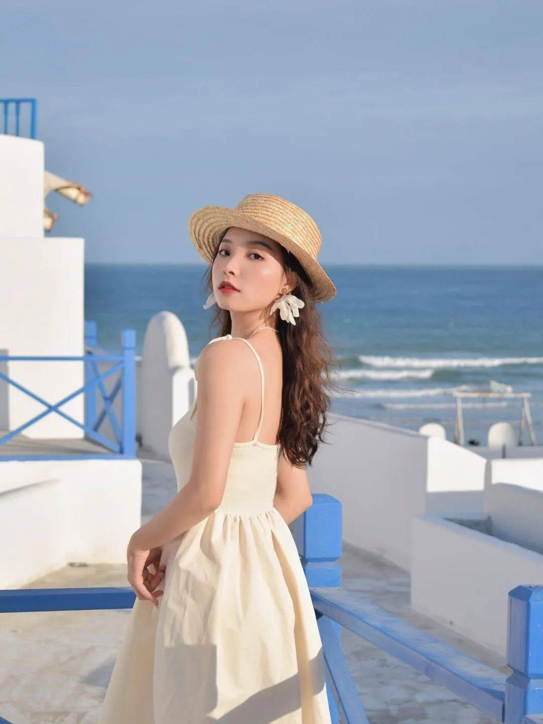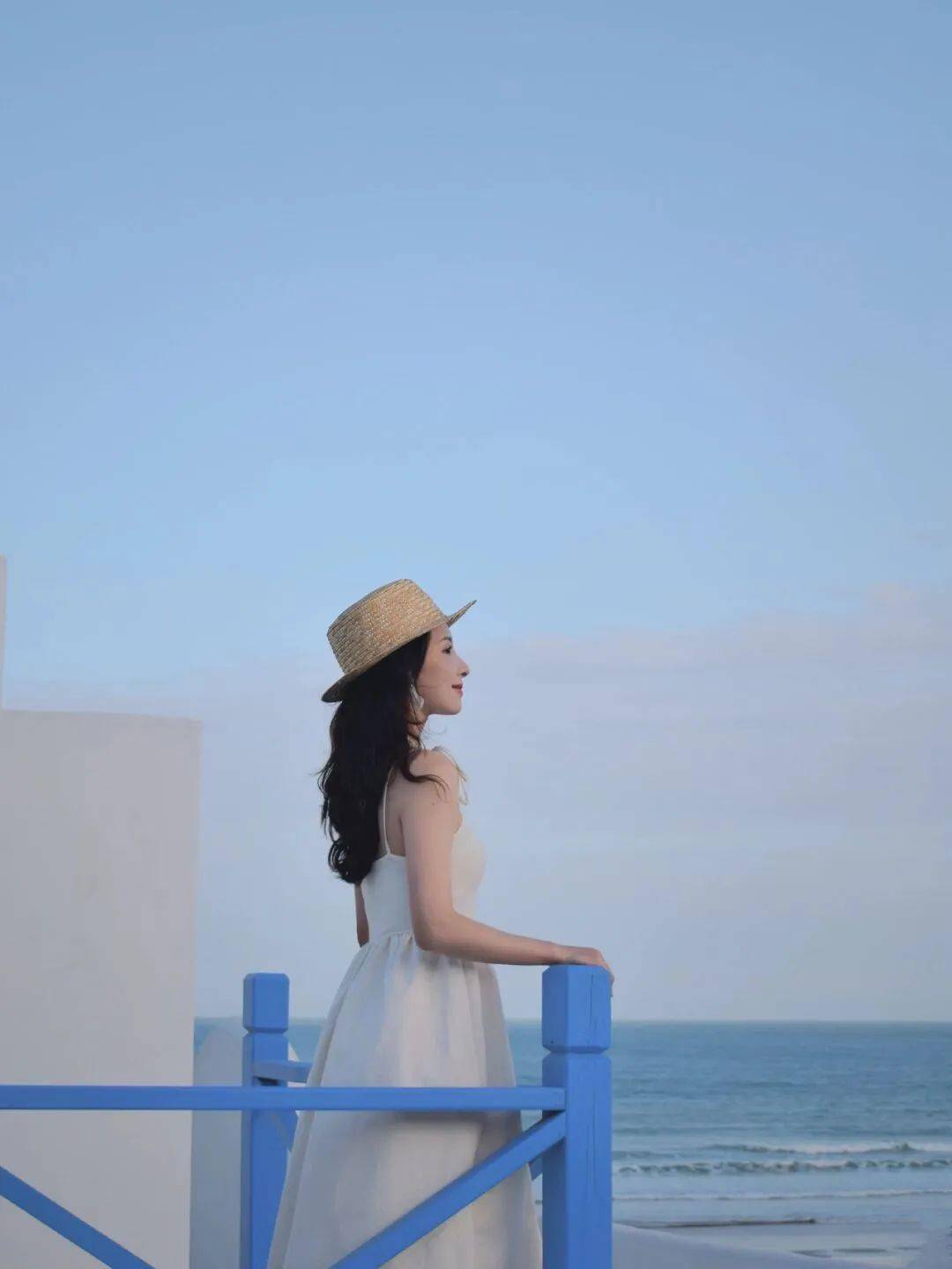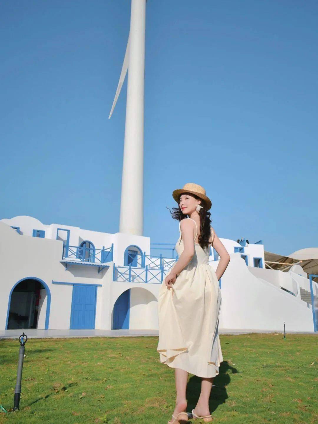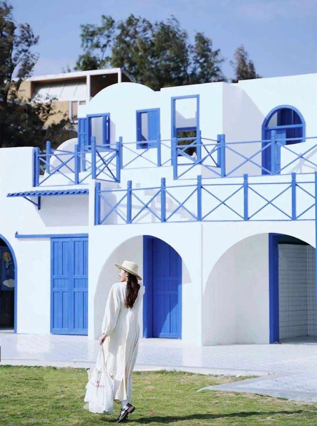 蓝白色建筑让人仿佛来到了圣托里尼,吹着海风, 以远处蓝色的海洋为背景,拍照很出片。