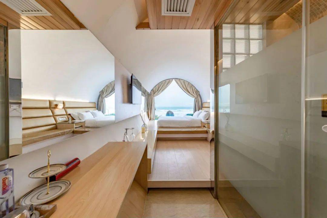 拥有 270°无敌海景特效,躺在床上感受观赏日出的最佳 C 位。同时也是小红书、抖音等网红达人的热门打卡房型。