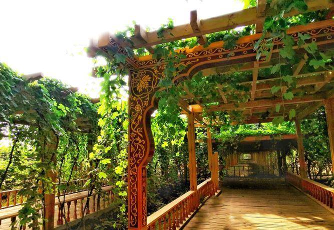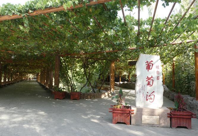 葡萄沟的葡萄走廊从此开始。首先看到的,就是这条葡萄园走廊的起始处,那是一座有着浓郁少数民族风情的圆顶凉亭,柏油路两旁的吊架上,攀附着蜿蜒曲折的葡萄树,这条葡萄园走廊绵延数千米。在这条路的另一端,有一个村子,里面有不少人,算是葡萄沟中的一个村子。
