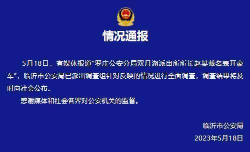 5月18日,有媒体报道“罗庄公安分局双月湖派出所所长赵某戴名表开豪车”,临沂市公安局已派出调查组针对反映的情况进行全面调查,调查结果将及时向社会公布。