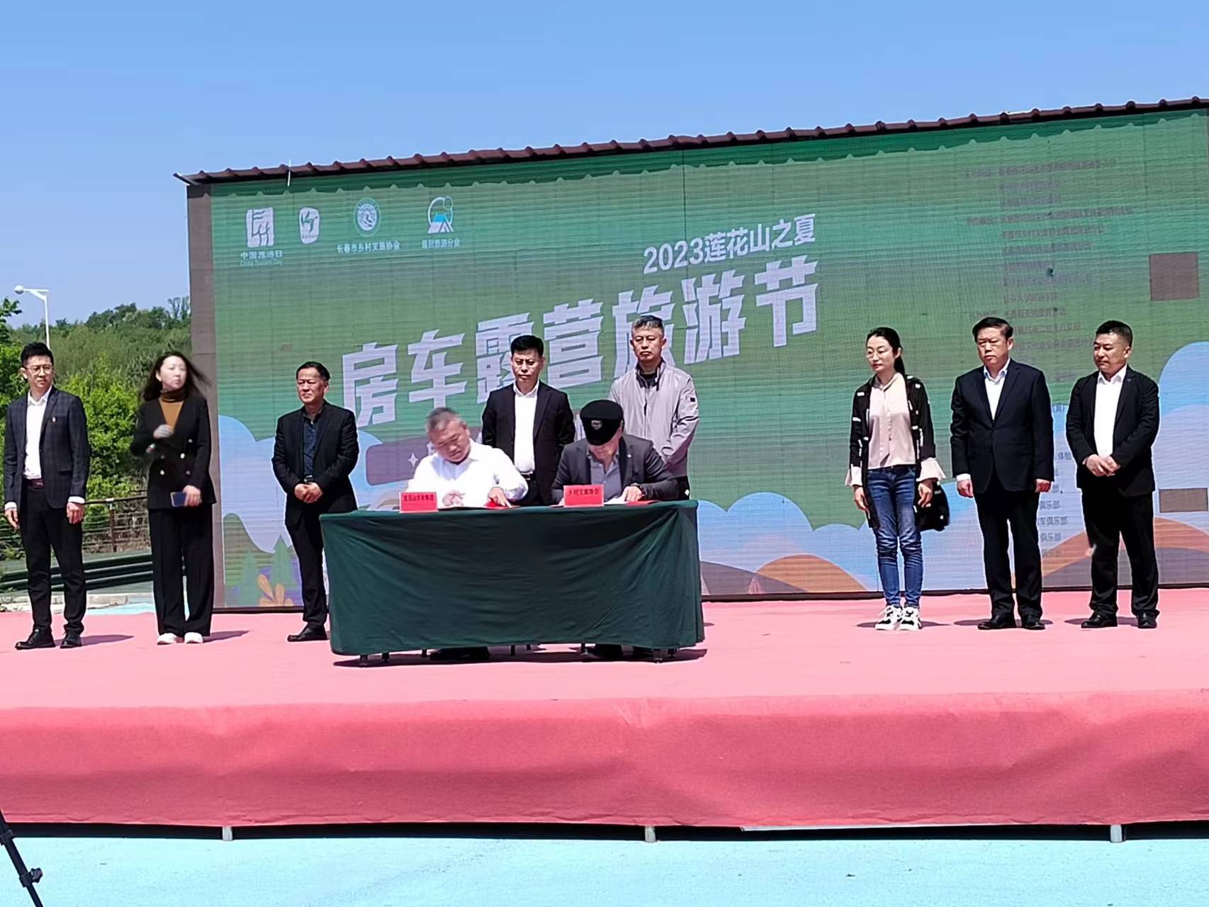 启动仪式上,长春莲花山生态旅游度假区管委会、长春市乡村文旅协会领导致辞。长春市乡村文旅协会与长春莲花山实业集团签署战略合作协议,长春旅游协会房车露营分会向俏天池度假营地授予《中国房车旅游露营地》牌匾。