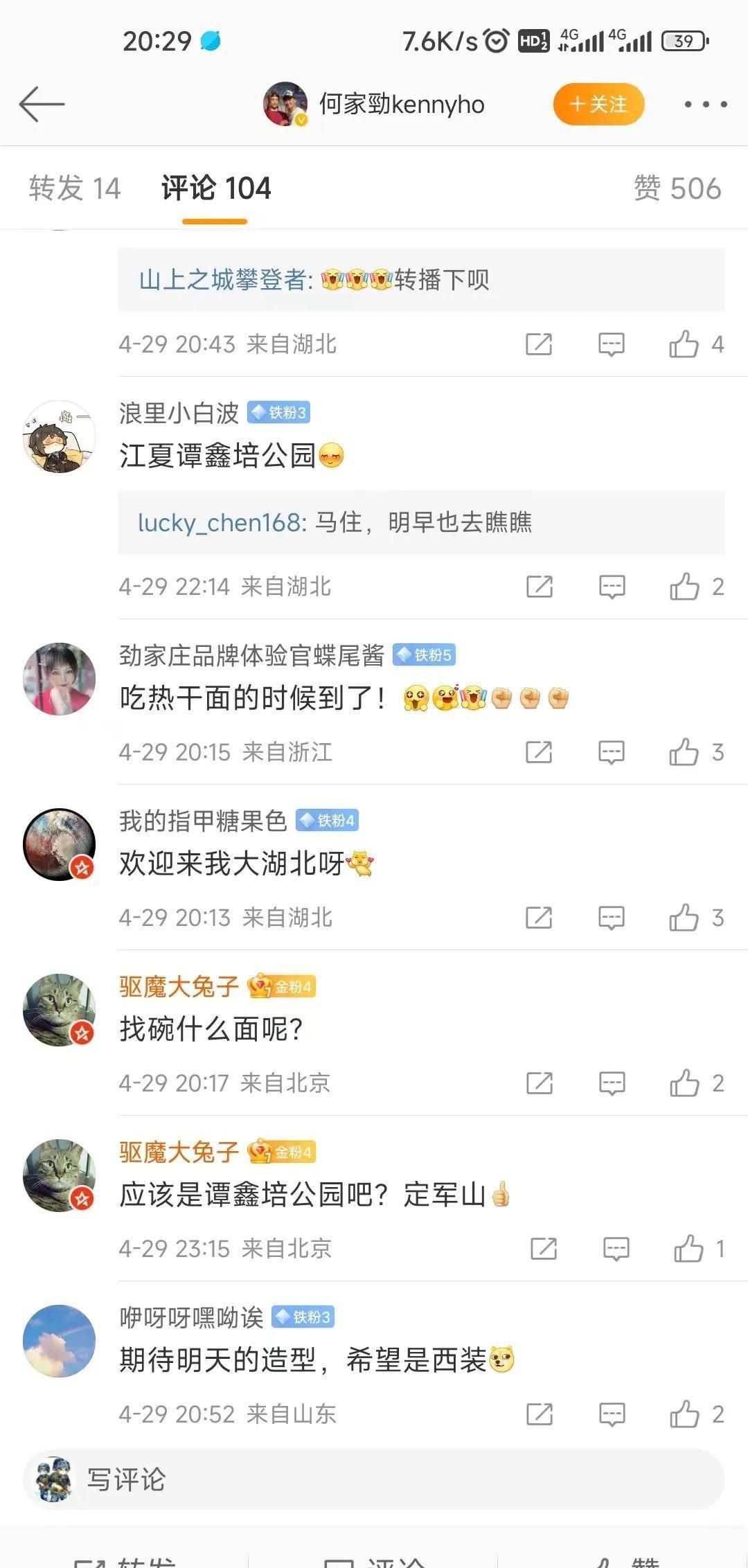 评论区的各位网友纷纷向何家劲安利起了江夏的美食美景↓