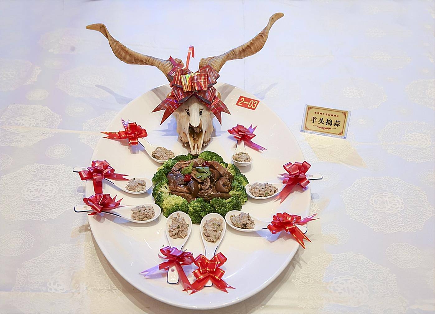 羊头捣蒜中的羊头采用的是羊头中最鲜美的肉,它经过厨师精心烹制,放置在羊头骨中间,沾着蒜香扑鼻的小料,不但味道让您无法忘怀,羊头骨更是充满了江湖的味道,必能助您酒兴。