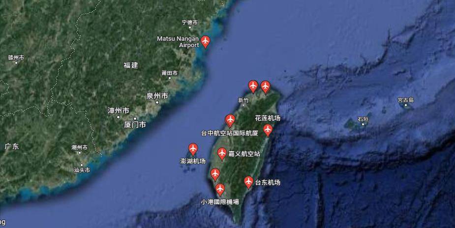除了澎湖列岛,东南方向的兰屿,金门岛,以及马祖列岛等岛屿上也分布着机场,从地图上看,整个台湾地区密密麻麻的分布着40多座机场。