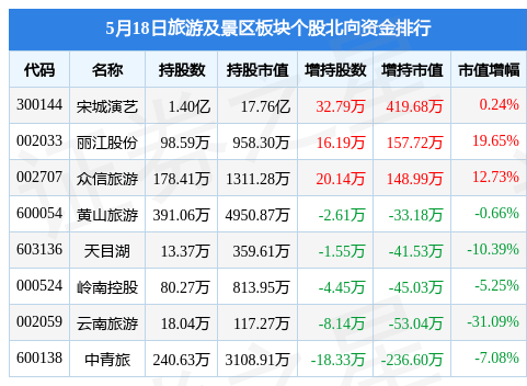 北向资金方面,当日旅游及景区板块北向资金持股市值为18.93亿元,增持317.01万元。其中增持最多的是宋城演艺,增持了419.68万元。减持持最多的是中青旅,减持了236.6万元。旅游及景区板块北向资金持股变动明细见下表: