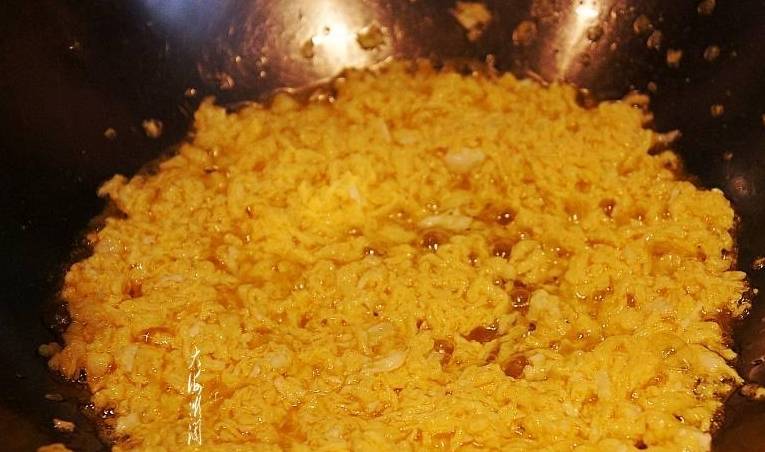 5、鸡蛋打散,搅拌均匀,炒锅加入适量多一点油,拌馅时不用另加油了,油开倒入蛋液,迅速用筷子搅拌,越碎越好,鸡蛋煎熟关火。
