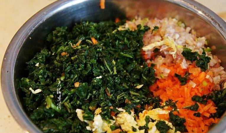 6、毛葱去皮洗净切碎,胡萝卜去皮洗净擦丝,再切碎,取大盆将煎好的鸡蛋和刺五加叶碎、毛葱碎、胡萝卜碎放入盆中。