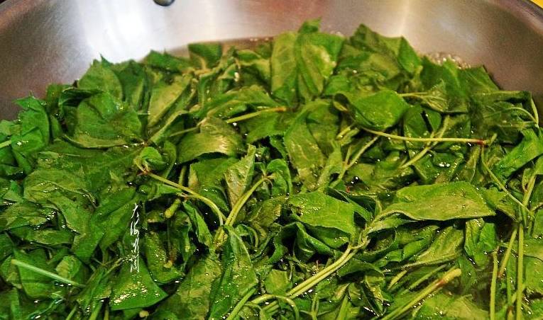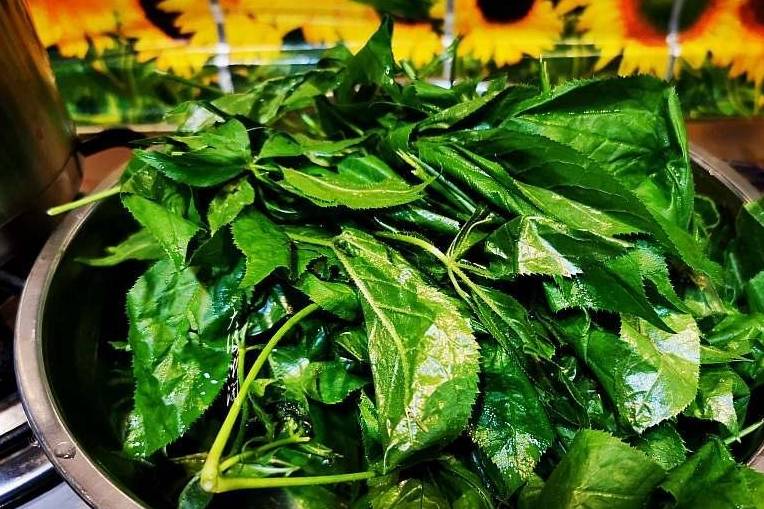 3、锅中加入适量的水,水开滴几滴油,下入刺五加叶焯水,滴油的目的是让刺五加叶保持嫩绿。