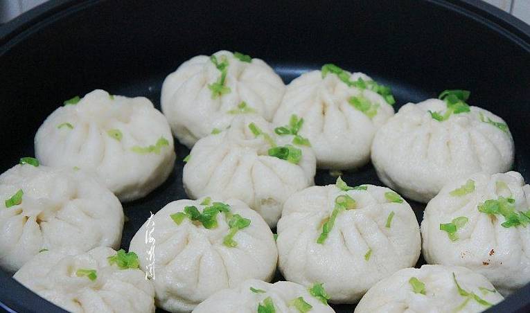 14、煎烤机设置中温,时间设置15分钟,启动电源开始煎包子,当用铲子能推动锅中的包子时,倒入半碗水,撒上葱花,盖上锅盖焖5分钟左右。