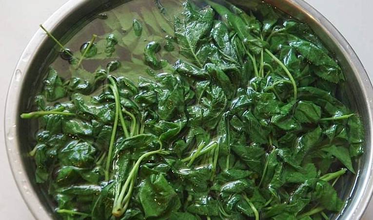 4、从锅中捞出刺五加叶过冷水,然后捞出攥掉水分,切碎备用。