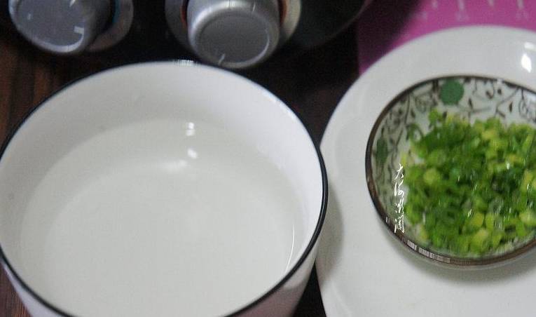13、准备点葱花,撒点盐,让葱花带有咸口味,准备半碗水备用。