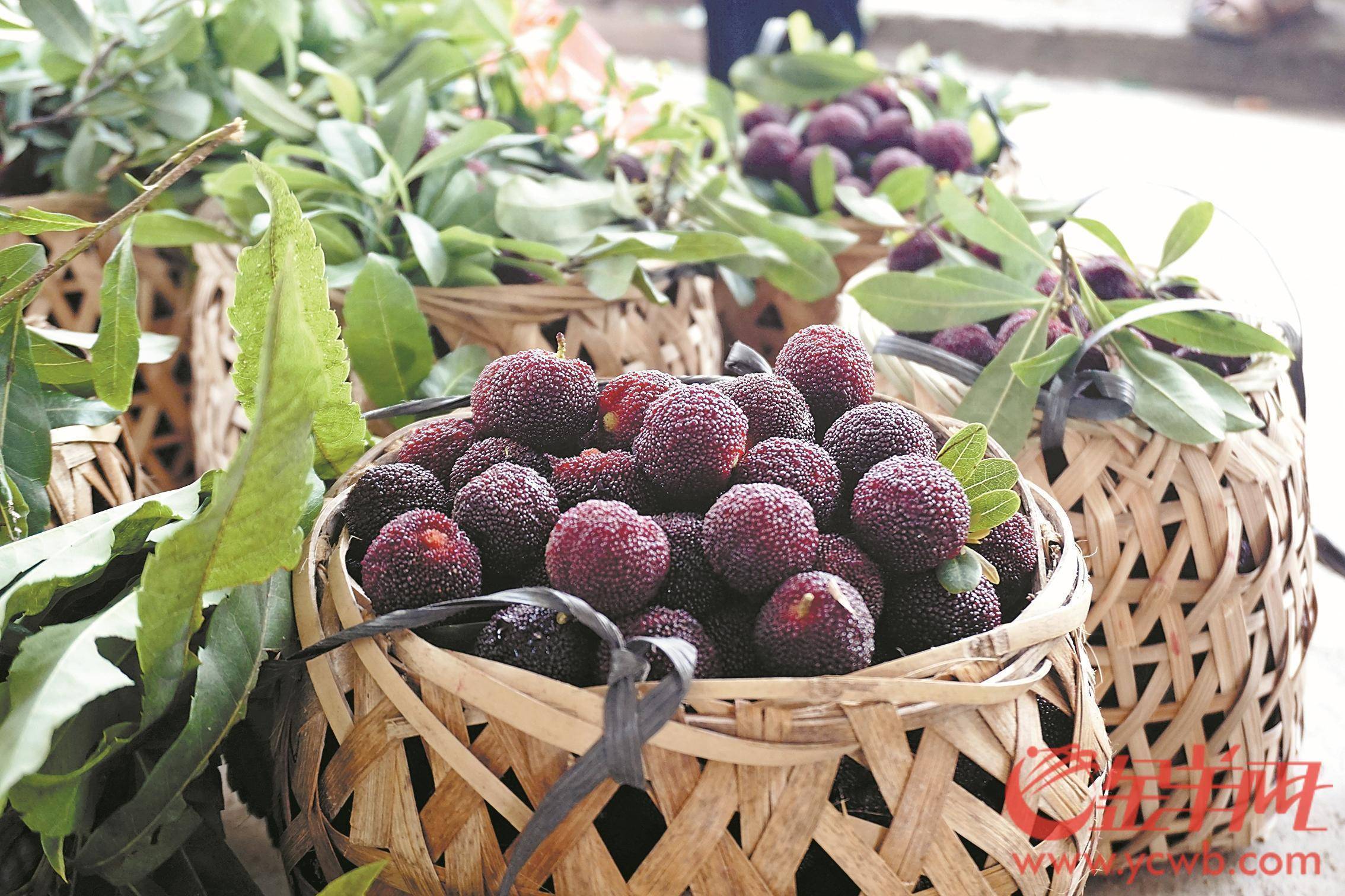 在景光村内的杨梅集市——杨梅圩,农户将新鲜的杨梅装满一个个竹筐,摊位前早早就围满了采购杨梅的市民游客,场面甚是热闹。