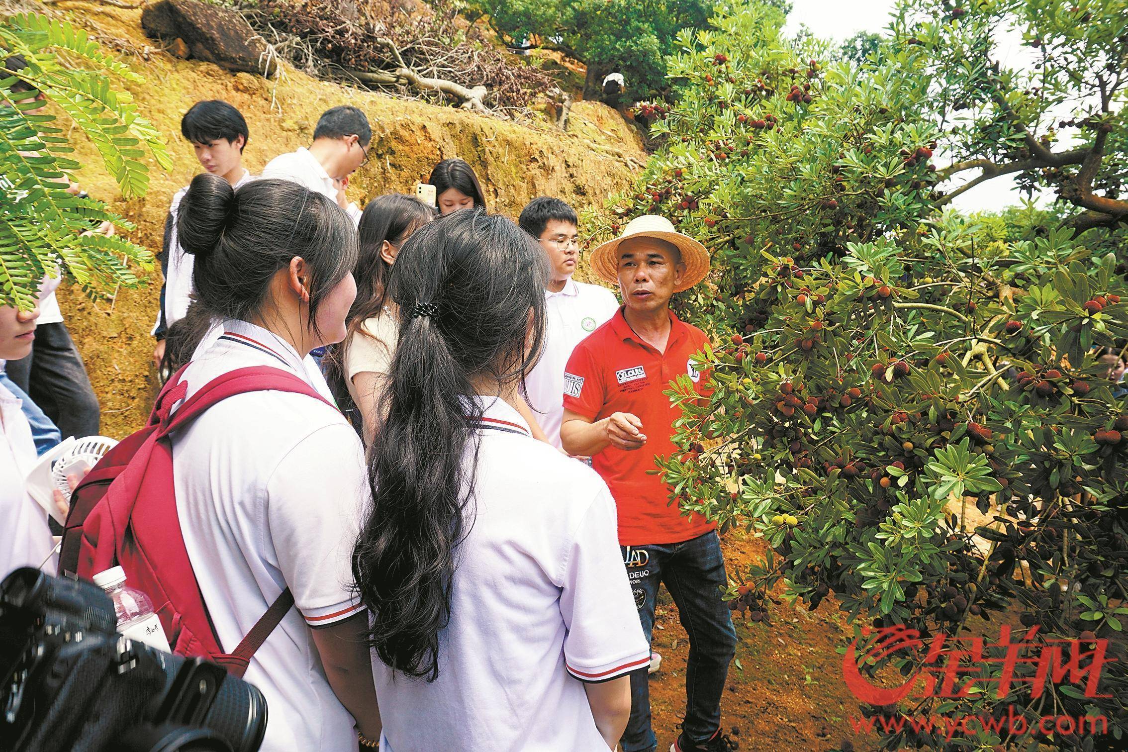 在景光村杨梅种植基地,普宁市黄埔职业技术学校的师生正围在农户杨惠潮的周围,听他讲解杨梅的历史文化和种植、采摘过程,并亲身体验采摘杨梅的乐趣。