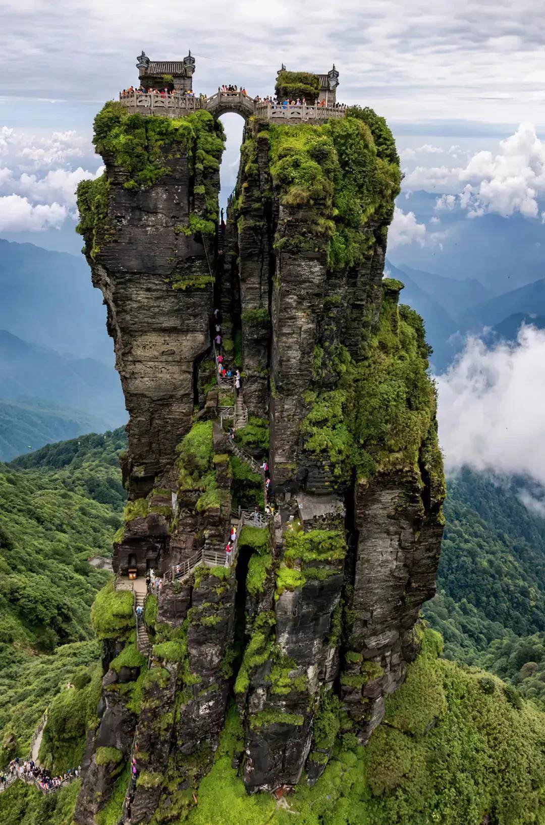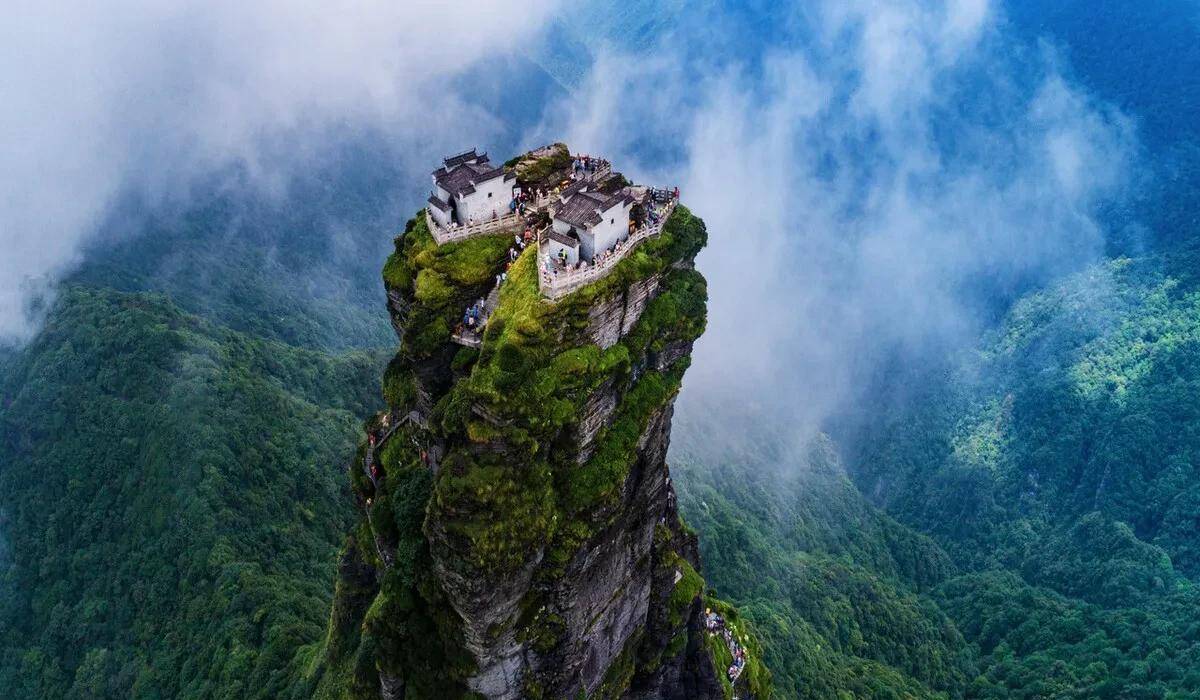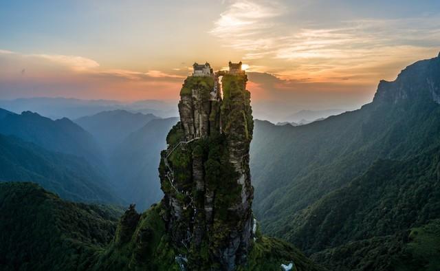 本就狭窄的山顶却有着一分为二的独特造型,形成了90度的断崖绝壁,在金顶还建有两座寺庙,一边供奉弥勒佛,一边供奉释迦佛。